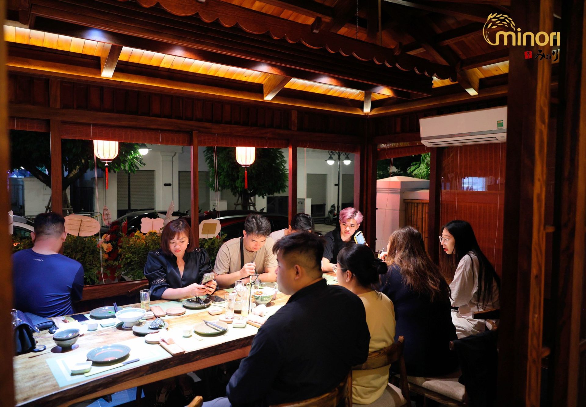 Điểm nhấn đầu tiên khi đến Minori chính là không gian mang đậm phong cách Nhật Bản. Thiết kế tối giản nhưng tinh tế, kết hợp ánh sáng ấm áp và chất liệu gỗ tự nhiên, tạo nên cảm giác gần gũi, thư giãn nhưng vẫn sang trọng.