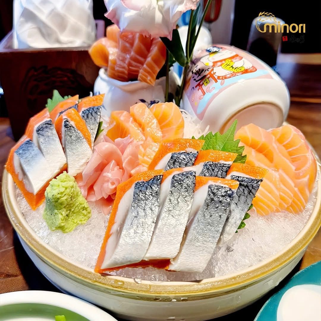 Sashimi tại Minori không chỉ ngon mà còn đẹp mắt nhờ cách bày trí nghệ thuật, kết hợp giữa màu sắc tự nhiên của hải sản và sự điểm xuyết của củ cải trắng, rong biển hay lá shiso – tạo nên một tổng thể hài hòa và sang trọng.